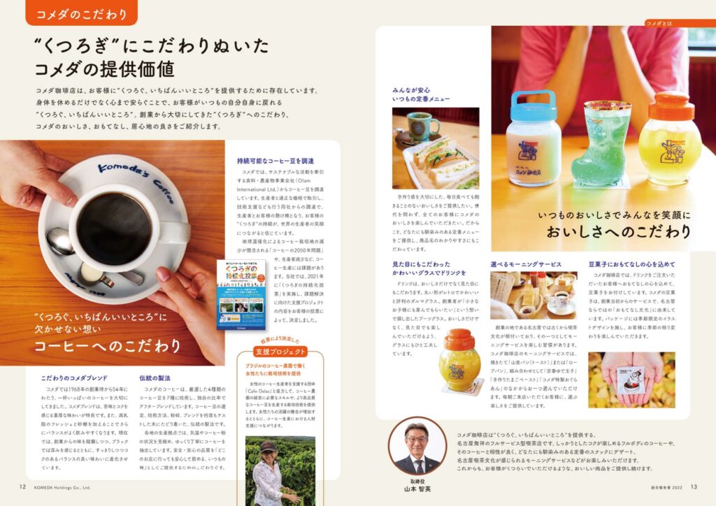 コメダホールディングスの統合報告書では、お客様に“くつろぎ”をご提供するためのこだわりや、コメダのサステナビリティ活動、中期経営計画「VALUES2025」などについて紹介しています!