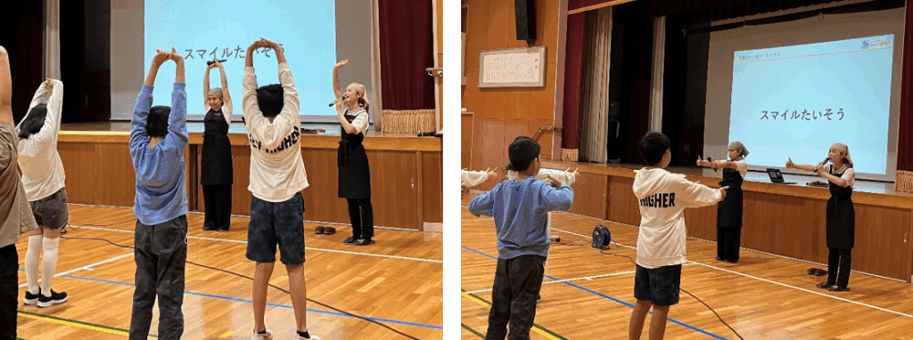 1時間目の授業は、名古屋の食文化である「なごやめし」や「喫茶文化」についての講義。喫茶文化が広がった理由にもなる「おもてなし」には、笑顔での接客が大切。コメダ珈琲店でスタッフが毎日行なっている「スマイル体操」は、顔の筋肉をほぐして自然な笑顔を引き出すウォーミングアップです。授業では子どもたちも一緒に体操を行い、笑顔の大切さを体感しました。