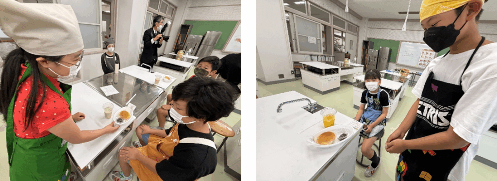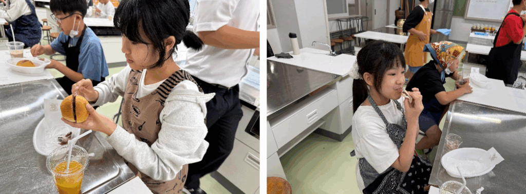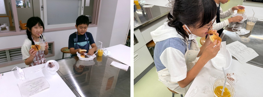スタッフ役を体験したら、今度はおいしく食べる番。ローブパンとコメダ特製小倉あんを味わいながら、くつろぎのひとときを過ごします。「おいしい!」「もう一個食べたい!」という嬉しい声が飛び交っていました。