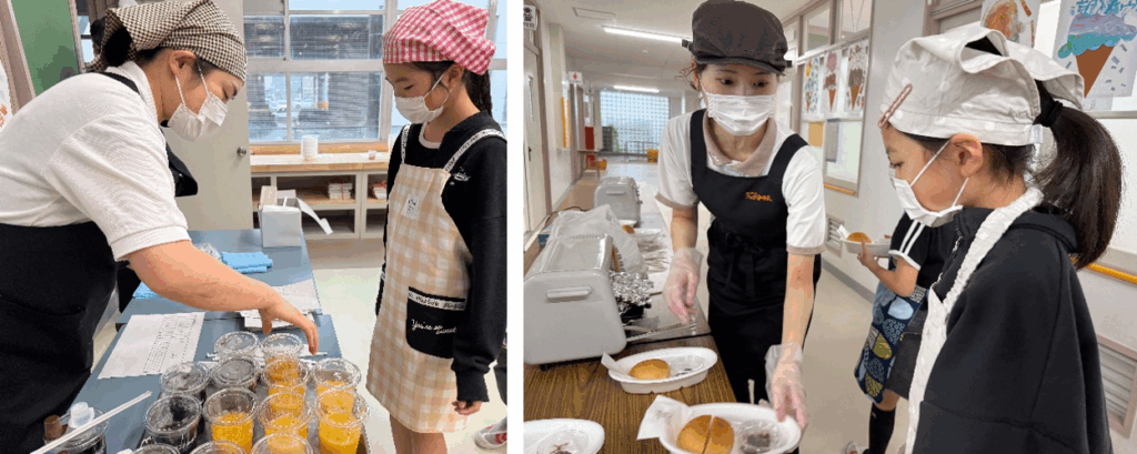 「いらっしゃいませ」「お待たせいたしました。モーニングCでございます」など、言いなれない言葉を使いながら、商品の提供を行います。お客様役のクラスメイトに最初は緊張した面持ちだった子どもたちも、授業が進むにつれて笑顔が増え、声のトーンも明るくなっていきました。最後にはスタッフ役の子みんなで「ありがとうございます!」と大きな声で伝えられ、教室に明るい声が響きました。なかには「またのお越しをお待ちしております。」と加えるなど、工夫も見られました。お客様が気持ちよくお過ごしいただくために一生懸命考え、勇気を出して加えたひと言は、おもてなしの心そのものでした。