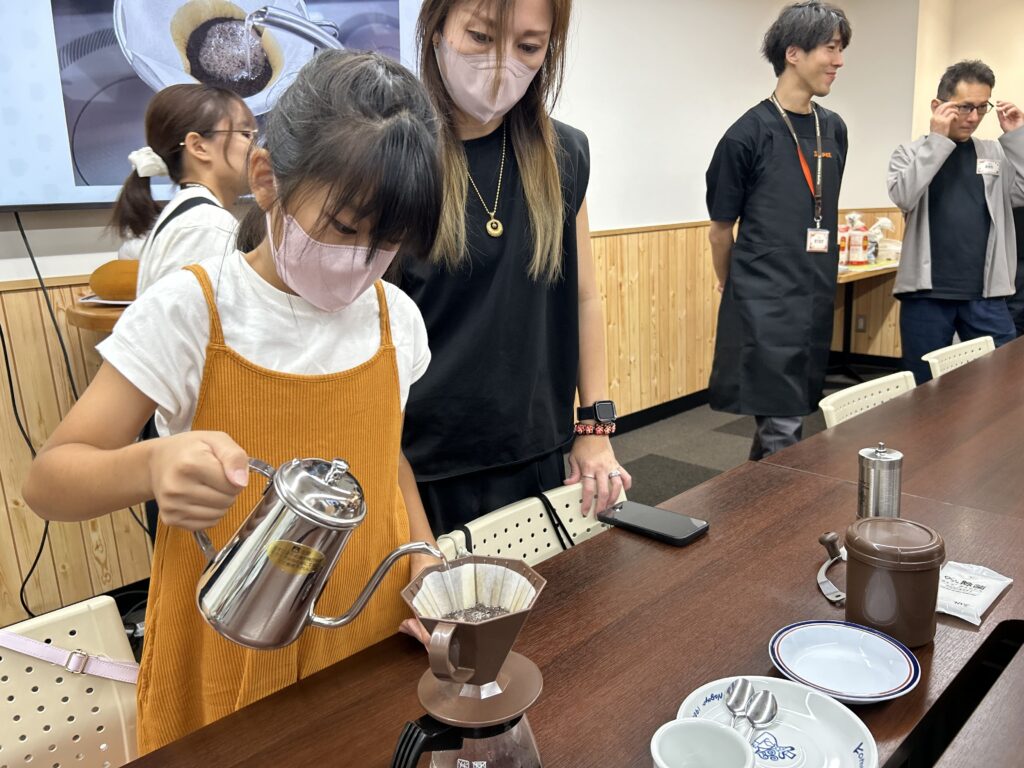 その後、自分で挽いた豆を使って、丁寧にお湯を注ぎ、初めての一杯を淹れる時間。緊張した面持ちでカップを手にする姿や、スタッフと一緒にホイップでアレンジを楽しむ様子からは、体験を通して生まれる小さな感動が伝わってきます。