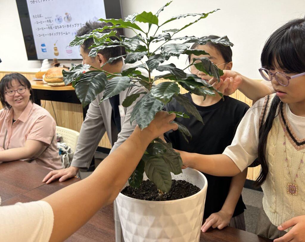 まずは、コーヒーができるまでの工程を動画で学び、実際にコーヒーの木に触れながら、豆の挽き方や香りの違いを体感。お子様たちは、初めて手にするミルのハンドルをゆっくりと回しながら、豆が粉になる様子に目を輝かせていました。
